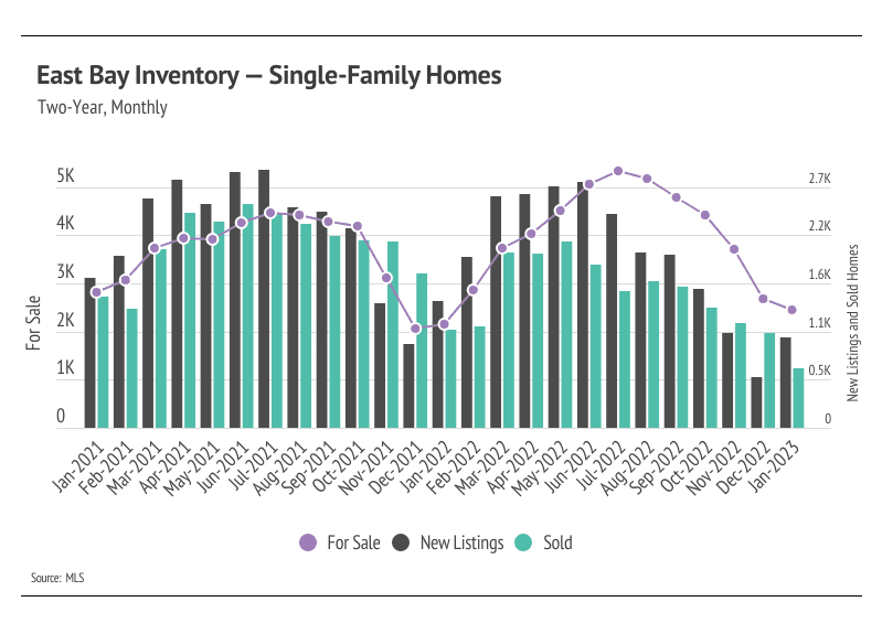Alameda inventory fell to an all-time-low level in January 2023, while the number of homes for sale in Contra Costa landed slightly above the record low reached in December 2021. Higher interest rates have dropped incentives for potential sellers and buyers to enter the market. Homeowners either bought or refinanced recently, locking in a historically low rate, so fewer listings are coming to market. Many potential buyers were priced out of the market as interest rates rose. New listings fell by 29% year-over-year, while sales declined by 41%. We still expect some inventory growth in the first half of the year, but inventory will likely remain low.