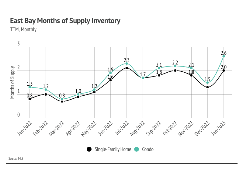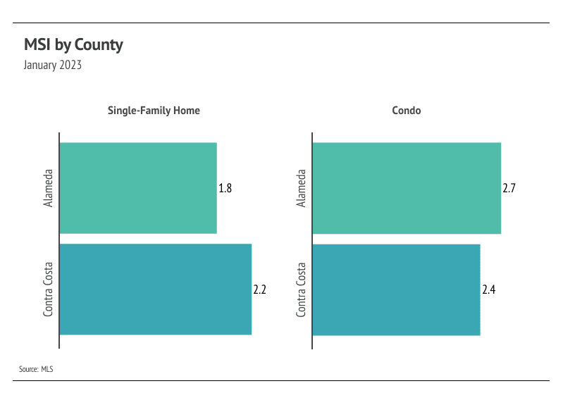 Months of Supply Inventory (MSI) quantifies the supply/demand relationship by measuring how many months it would take for all current homes listed on the market to sell at the current rate of sales. The long-term average MSI is around three months in California, which indicates a balanced market. An MSI lower than three indicates that there are more buyers than sellers on the market (meaning it’s a sellers’ market), while a higher MSI indicates there are more sellers than buyers (meaning it’s a buyers’ market). East Bay MSI moved higher again in January, nearing balance for condos but still a sellers’ market for both single-family homes and condos.